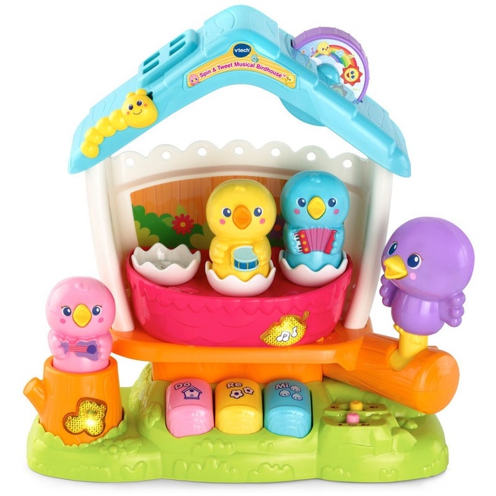 Hello friend! Welcome to our house! Discover 3 musical instruments, sounds, colours and numbers with the Singing Bird House by VTech! Put the cute baby birds in the nest to pop and spin them around for fun musical responses. The baby birds love to sing and will harmonise when placed into the nest one at a time. Place the birds onto the tree trunk to hear the instrument they are holding play in music mode and in learning mode you will hear instrument facts. Includes three light up buttons that teach objects, 2 uplifting sing-along songs and 15 fun melodies.