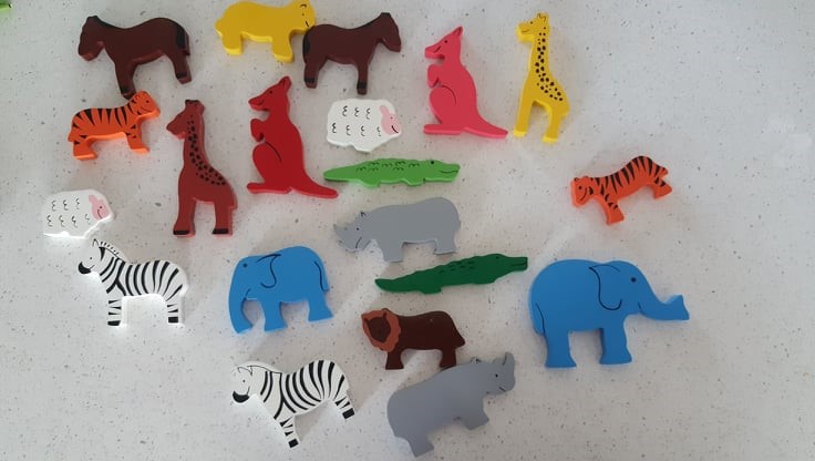 A set of wooden zoo animals. Pairs of tigers, lions, sheep, horses, kangaroons, giraffes, elephants, zebras, rhinos and crocodiles.