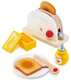 The Pop-up Toaster Set includes a toaster, two slices of bread, butter, honey, knife and a plate. Made with high-quality wood for a realistic, modern look that will inspire play and fire children`s imaginations. Accessories such as butter, jam, and knife add realism to the toy that children will love. Butter tub comes with removable lid. Includes eye-catching graphics.